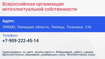 Всероссийская организация интеллектуальной собственности по адресу 398000, Липецкая область, Липецк, Тельмана, 116 в дальнейшем Организация, размещена в следующих категориях: