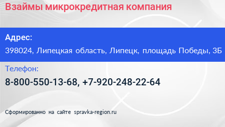 Взаймы, микрокредитная компания по адресу 398024, Липецкая область, Липецк, площадь Победы, 3Б в дальнейшем Организация, размещена в следующих категориях: