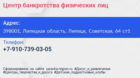 Центр банкротства физических лиц по адресу 398001, Липецкая область, Липецк, Советская, 64 ст1 в дальнейшем Организация, размещена в следующих категориях: