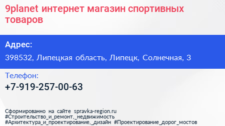 9planet, интернет-магазин спортивных товаров по адресу 398532, Липецкая область, Липецк, Солнечная, 3 в дальнейшем Организация, размещена в следующих категориях: