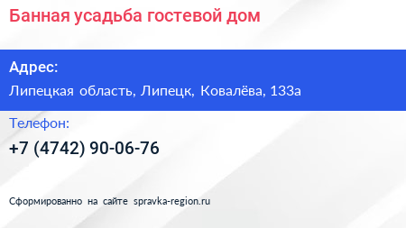 Банная усадьба, гостевой дом по адресу Липецкая область, Липецк, Ковалёва, 133а в дальнейшем Организация, размещена в следующих категориях: