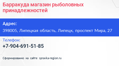 Барракуда, магазин рыболовных принадлежностей по адресу 398005, Липецкая область, Липецк, проспект Мира, 27 в дальнейшем Организация, размещена в следующих категориях: