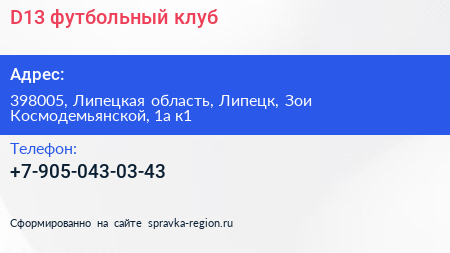 D13, футбольный клуб по адресу 398005, Липецкая область, Липецк, Зои Космодемьянской, 1а к1 в дальнейшем Организация, размещена в следующих категориях: