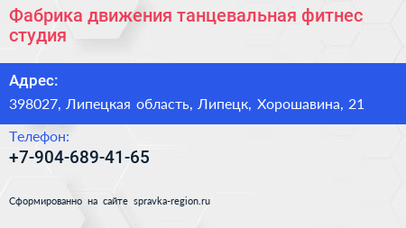 Фабрика движения, танцевальная фитнес-студия по адресу 398027, Липецкая область, Липецк, Хорошавина, 21 в дальнейшем Организация, размещена в следующих категориях: