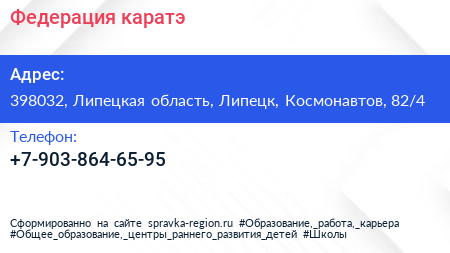 Федерация каратэ по адресу 398032, Липецкая область, Липецк, Космонавтов, 82/4 в дальнейшем Организация, размещена в следующих категориях: