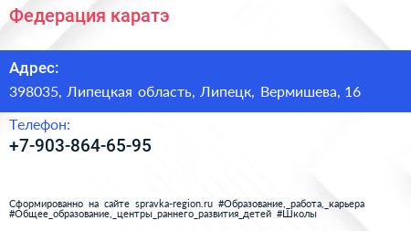 Федерация каратэ по адресу 398035, Липецкая область, Липецк, Вермишева, 16 в дальнейшем Организация, размещена в следующих категориях: