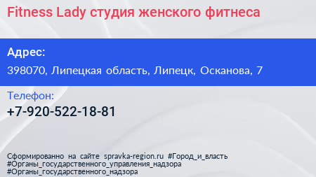 Fitness Lady, студия женского фитнеса по адресу 398070, Липецкая область, Липецк, Осканова, 7 в дальнейшем Организация, размещена в следующих категориях: