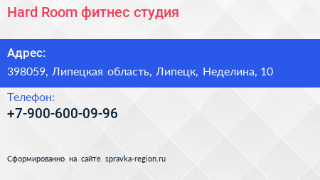 Hard Room, фитнес-студия по адресу 398059, Липецкая область, Липецк, Неделина, 10 в дальнейшем Организация, размещена в следующих категориях: