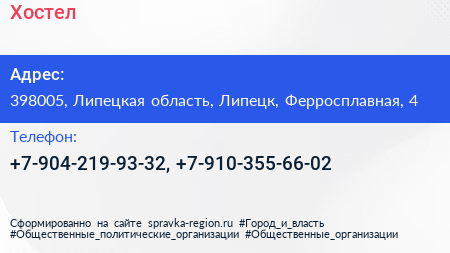 Хостел по адресу 398005, Липецкая область, Липецк, Ферросплавная, 4 в дальнейшем Организация, размещена в следующих категориях: