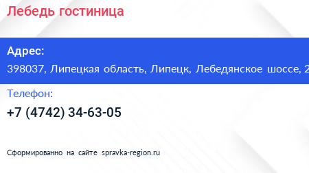 Лебедь, гостиница по адресу 398037, Липецкая область, Липецк, Лебедянское шоссе, 2 в дальнейшем Организация, размещена в следующих категориях: