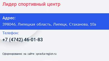 Лидер, спортивный центр по адресу 398046, Липецкая область, Липецк, Стаханова, 10а в дальнейшем Организация, размещена в следующих категориях: