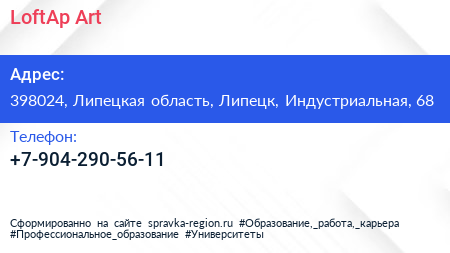 LoftAp.Art по адресу 398024, Липецкая область, Липецк, Индустриальная, 68 в дальнейшем Организация, размещена в следующих категориях: