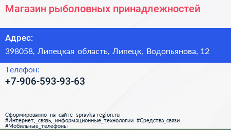 Магазин рыболовных принадлежностей по адресу 398058, Липецкая область, Липецк, Водопьянова, 12 в дальнейшем Организация, размещена в следующих категориях:
