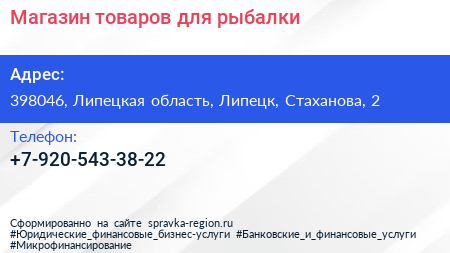 Магазин товаров для рыбалки по адресу 398046, Липецкая область, Липецк, Стаханова, 2 в дальнейшем Организация, размещена в следующих категориях:
