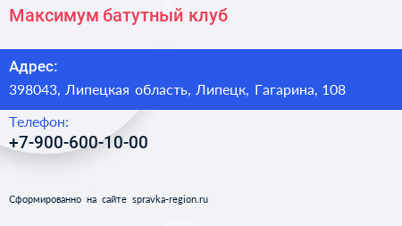 Максимум, батутный клуб по адресу 398043, Липецкая область, Липецк, Гагарина, 108 в дальнейшем Организация, размещена в следующих категориях: