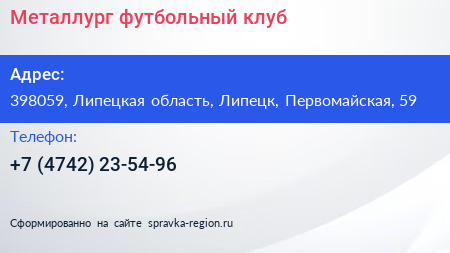 Металлург, футбольный клуб по адресу 398059, Липецкая область, Липецк, Первомайская, 59 в дальнейшем Организация, размещена в следующих категориях: