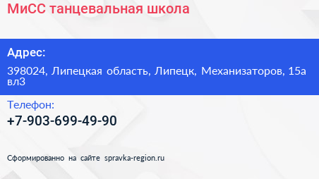 МиСС, танцевальная школа по адресу 398024, Липецкая область, Липецк, Механизаторов, 15а вл3 в дальнейшем Организация, размещена в следующих категориях: