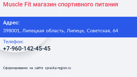 Muscle & Fit, магазин спортивного питания по адресу 398001, Липецкая область, Липецк, Советская, 64 в дальнейшем Организация, размещена в следующих категориях: