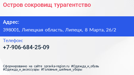 Остров сокровищ, турагентство по адресу 398001, Липецкая область, Липецк, 8 Марта, 26/2 в дальнейшем Организация, размещена в следующих категориях: