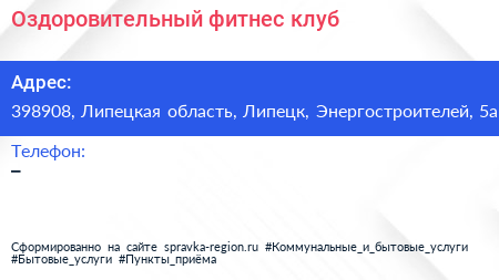 Оздоровительный фитнес-клуб по адресу 398908, Липецкая область, Липецк, Энергостроителей, 5а в дальнейшем Организация, размещена в следующих категориях: