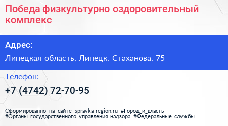Победа, физкультурно-оздоровительный комплекс по адресу Липецкая область, Липецк, Стаханова, 75 в дальнейшем Организация, размещена в следующих категориях: