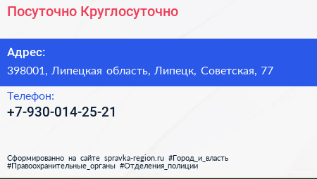 Посуточно & Круглосуточно по адресу 398001, Липецкая область, Липецк, Советская, 77 в дальнейшем Организация, размещена в следующих категориях: