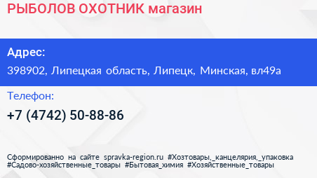 РЫБОЛОВ-ОХОТНИК, магазин по адресу 398902, Липецкая область, Липецк, Минская, вл49а в дальнейшем Организация, размещена в следующих категориях: