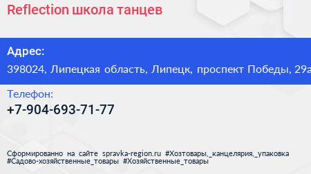 Reflection, школа танцев по адресу 398024, Липецкая область, Липецк, проспект Победы, 29а в дальнейшем Организация, размещена в следующих категориях: