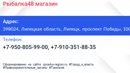 Рыбалка48, магазин по адресу 398024, Липецкая область, Липецк, проспект Победы, 100 в дальнейшем Организация, размещена в следующих категориях: