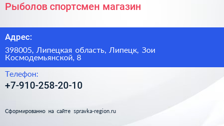 Рыболов-спортсмен, магазин по адресу 398005, Липецкая область, Липецк, Зои Космодемьянской, 8 в дальнейшем Организация, размещена в следующих категориях: