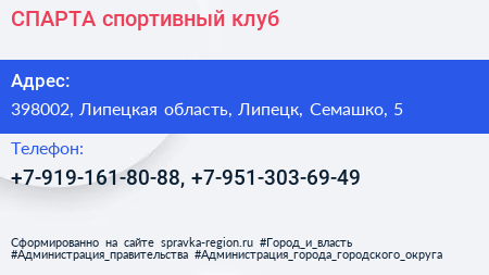 СПАРТА, спортивный клуб по адресу 398002, Липецкая область, Липецк, Семашко, 5 в дальнейшем Организация, размещена в следующих категориях:
