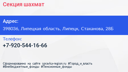 Секция шахмат по адресу 398036, Липецкая область, Липецк, Стаханова, 28Б в дальнейшем Организация, размещена в следующих категориях: