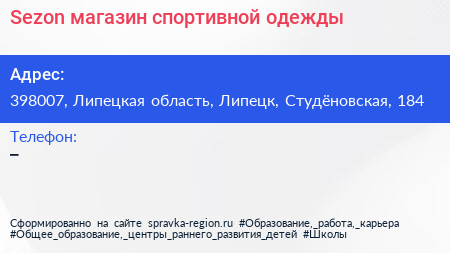 Sezon, магазин спортивной одежды по адресу 398007, Липецкая область, Липецк, Студёновская, 184 в дальнейшем Организация, размещена в следующих категориях:
