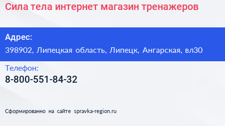 Сила тела, интернет-магазин тренажеров по адресу 398902, Липецкая область, Липецк, Ангарская, вл30 в дальнейшем Организация, размещена в следующих категориях: