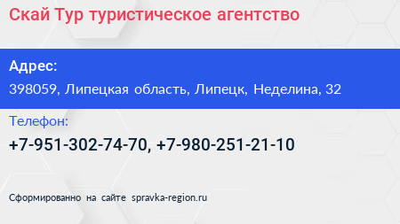 Скай Тур, туристическое агентство по адресу 398059, Липецкая область, Липецк, Неделина, 32 в дальнейшем Организация, размещена в следующих категориях:
