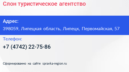 Слон, туристическое агентство по адресу 398059, Липецкая область, Липецк, Первомайская, 57 в дальнейшем Организация, размещена в следующих категориях: