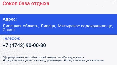 Сокол, база отдыха по адресу Липецкая область, Липецк, Матырское водохранилище, Сокол в дальнейшем Организация, размещена в следующих категориях: