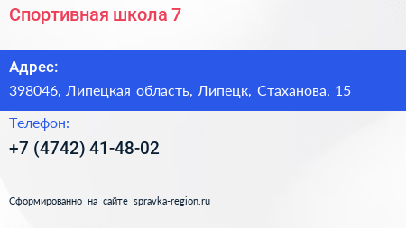 Спортивная школа №7 по адресу 398046, Липецкая область, Липецк, Стаханова, 15 в дальнейшем Организация, размещена в следующих категориях: