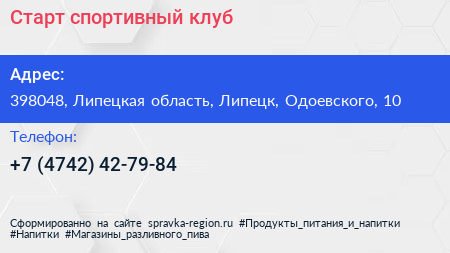 Старт, спортивный клуб по адресу 398048, Липецкая область, Липецк, Одоевского, 10 в дальнейшем Организация, размещена в следующих категориях: