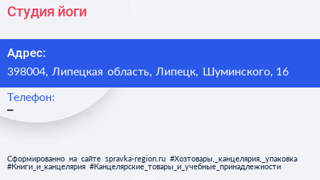 Студия йоги по адресу 398004, Липецкая область, Липецк, Шуминского, 16 в дальнейшем Организация, размещена в следующих категориях: