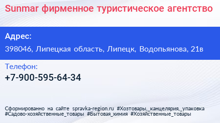 Sunmar, фирменное туристическое агентство по адресу 398046, Липецкая область, Липецк, Водопьянова, 21в в дальнейшем Организация, размещена в следующих категориях: