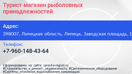 Турист, магазин рыболовных принадлежностей по адресу 398007, Липецкая область, Липецк, Заводская площадь, 1 в дальнейшем Организация, размещена в следующих категориях: