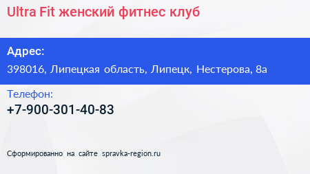 Ultra Fit, женский фитнес-клуб по адресу 398016, Липецкая область, Липецк, Нестерова, 8а в дальнейшем Организация, размещена в следующих категориях:
