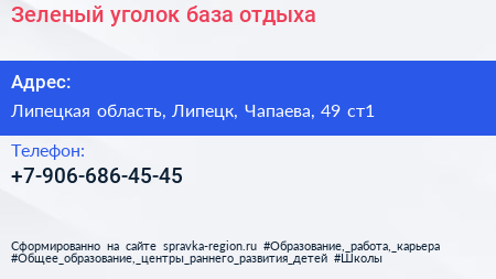 Зеленый уголок, база отдыха по адресу Липецкая область, Липецк, Чапаева, 49 ст1 в дальнейшем Организация, размещена в следующих категориях:
