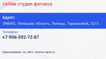 тАЛия, студия фитнеса по адресу 398043, Липецкая область, Липецк, Терешковой, 32/3 в дальнейшем Организация, размещена в следующих категориях: