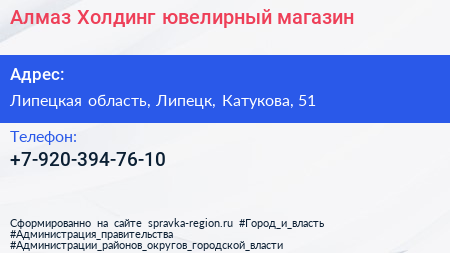 Алмаз-Холдинг, ювелирный магазин по адресу Липецкая область, Липецк, Катукова, 51 в дальнейшем Организация, размещена в следующих категориях: