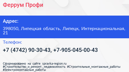 Феррум-Профи по адресу 398050, Липецкая область, Липецк, Интернациональная, 21 в дальнейшем Организация, размещена в следующих категориях: