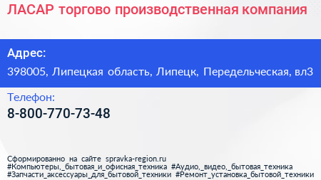 ЛАСАР, торгово-производственная компания по адресу 398005, Липецкая область, Липецк, Передельческая, вл3 в дальнейшем Организация, размещена в следующих категориях:
