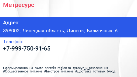 Метресурс по адресу 398002, Липецкая область, Липецк, Балмочных, 6 в дальнейшем Организация, размещена в следующих категориях:
