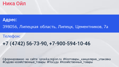 Ника-Ойл по адресу 398056, Липецкая область, Липецк, Цементников, 7а в дальнейшем Организация, размещена в следующих категориях: